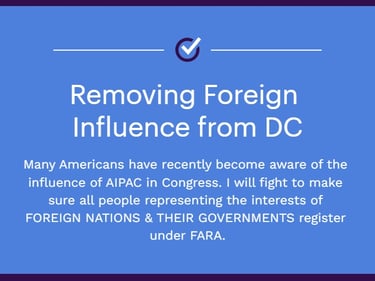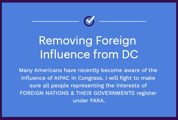 Currently, anyone working as an agent for foreign principals in political activities has to register under the Foreign Agents Registration Act (FARA). But groups like AIPAC and others representing Israel’s interests, such as DMFI, aren’t registered. I'm going to make sure all Israel-associated PACs have to follow the same rules as all other foreign lobbies.