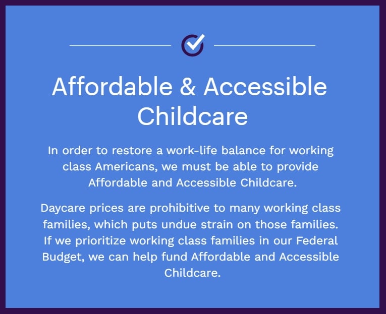 This act will address the childcare crisis by: "ensuring families can afford the childcare they need, expanding access to more high-quality options, stabilizing the childcare sector, and helping ensure childcare workers taking care of our nation’s kids are paid livable wages. The legislation will also dramatically expand access to pre-K, and support full-day, full-year Head Start programs and increased wages for Head Start workers"1